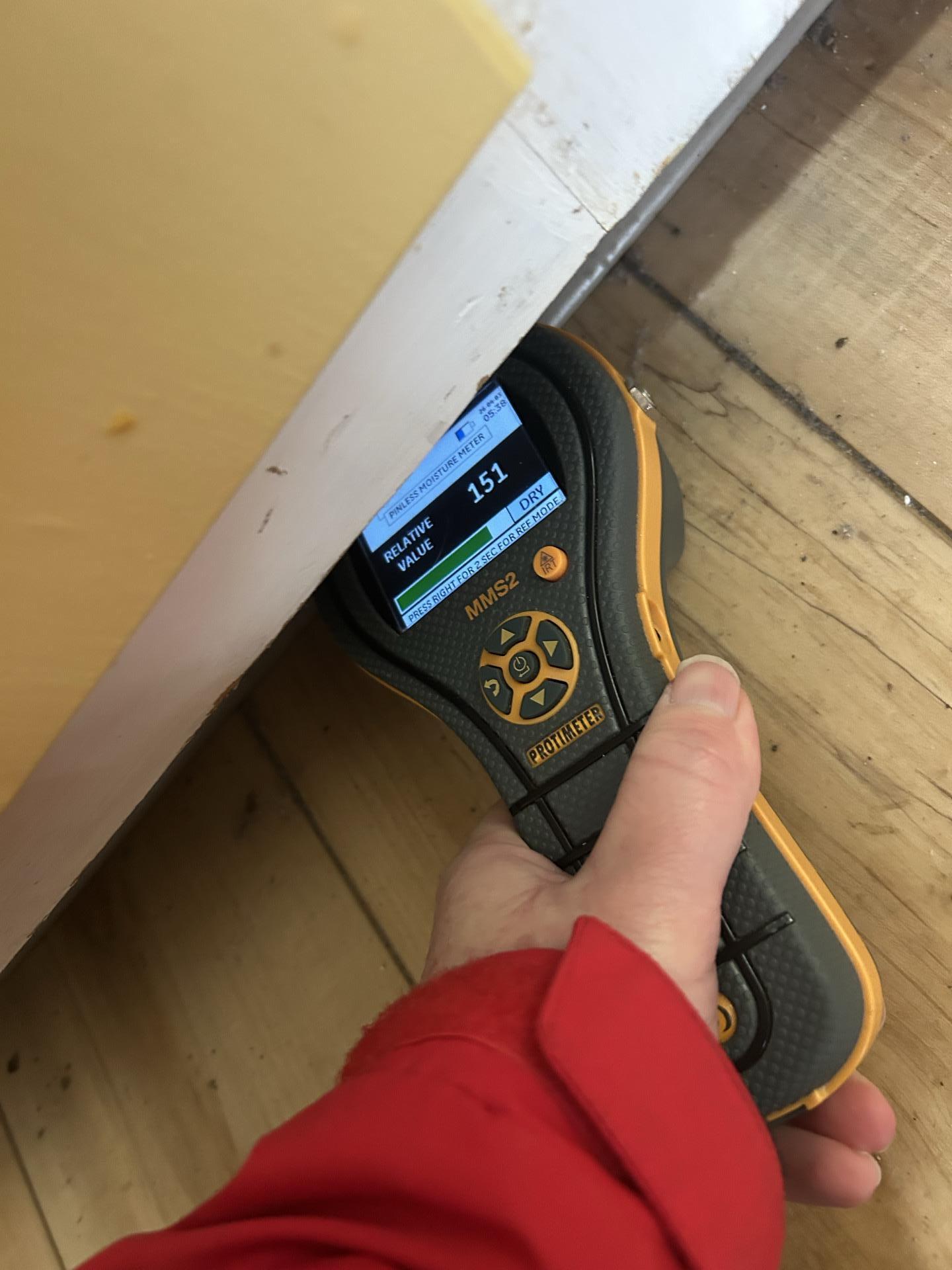 The customer experienced significant water damage in their kitchen, leading to moisture saturation in the subfloor and visible mold growth, requiring immediate remediation and drying services.