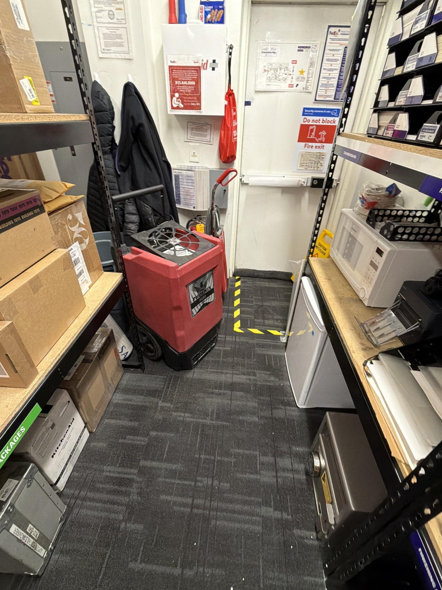 Strategic Airflow: Positioning professional-grade drying equipment within the office and shipping areas to protect inventory and restore the facility to pre-loss condition quickly.