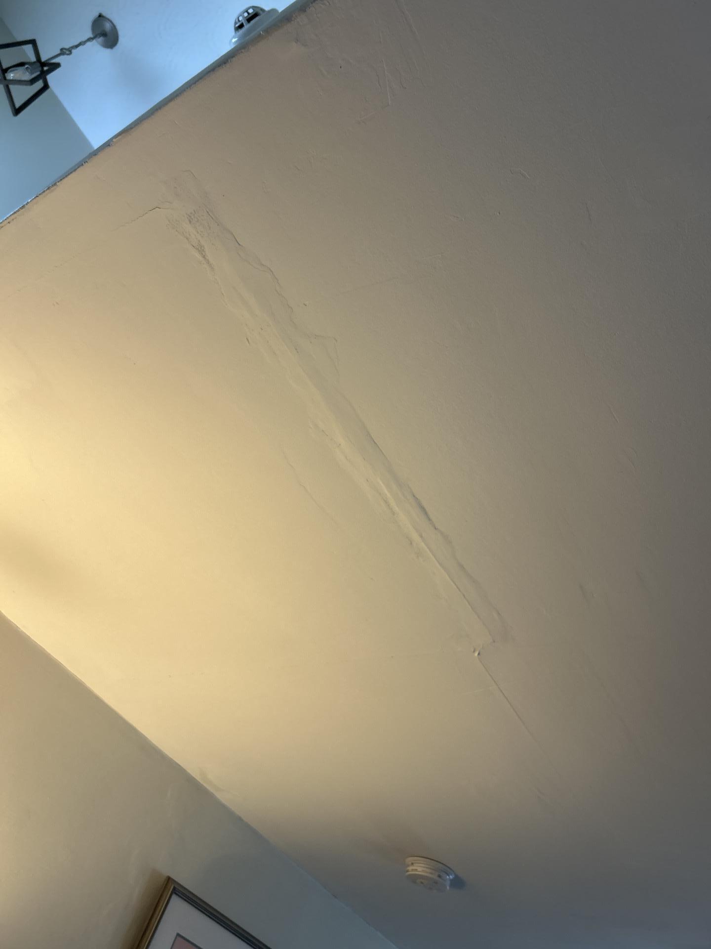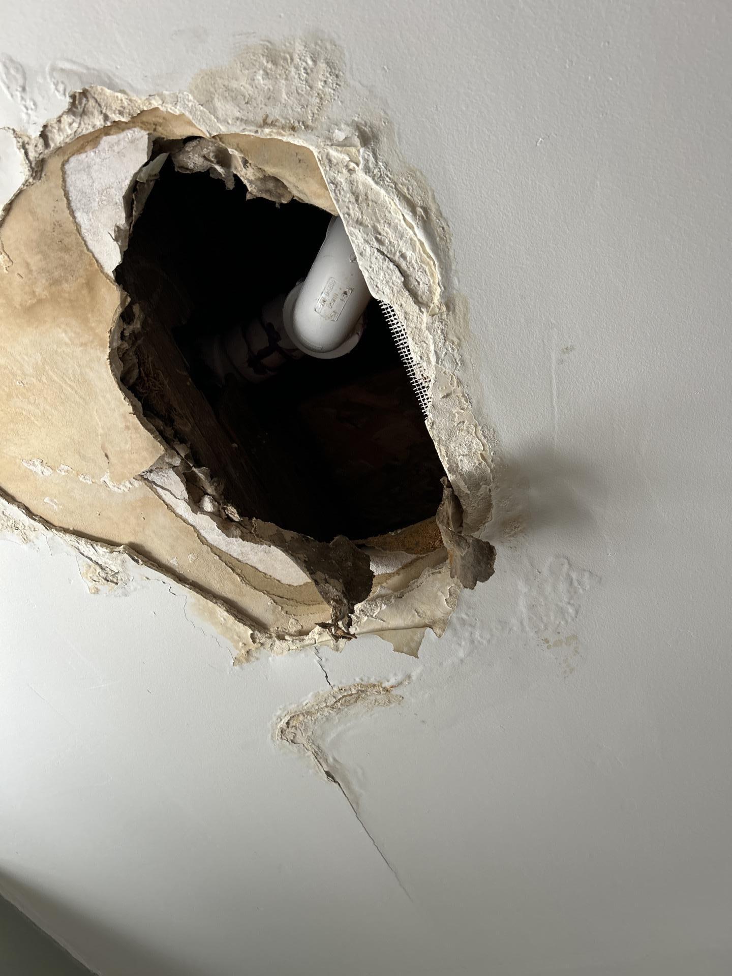 The customer contacted us to address a severe water leak that caused visible structural damage and staining to their ceiling. The intrusion had weakened the drywall, leading to cracking and a large hole that exposed plumbing fixtures and internal framing.