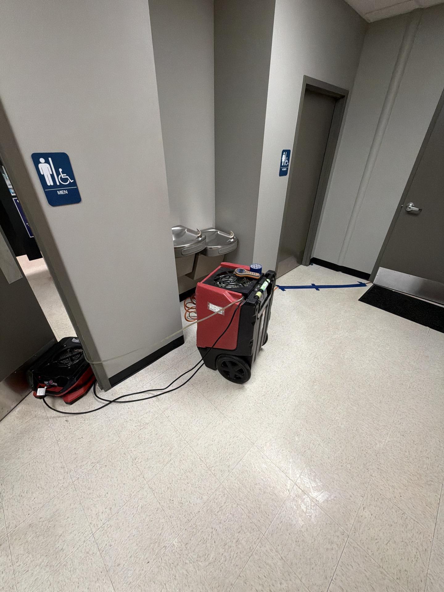 The customer contacted us to address an urgent water damage incident in a commercial restroom and hallway area. A plumbing failure involving a urinal resulted in significant water overflow, causing saturation of the floor tiles and spreading moisture into the common hallways near the water fountains. Immediate intervention was required to prevent structural damage, slip hazards, and long-term mold growth within the facility